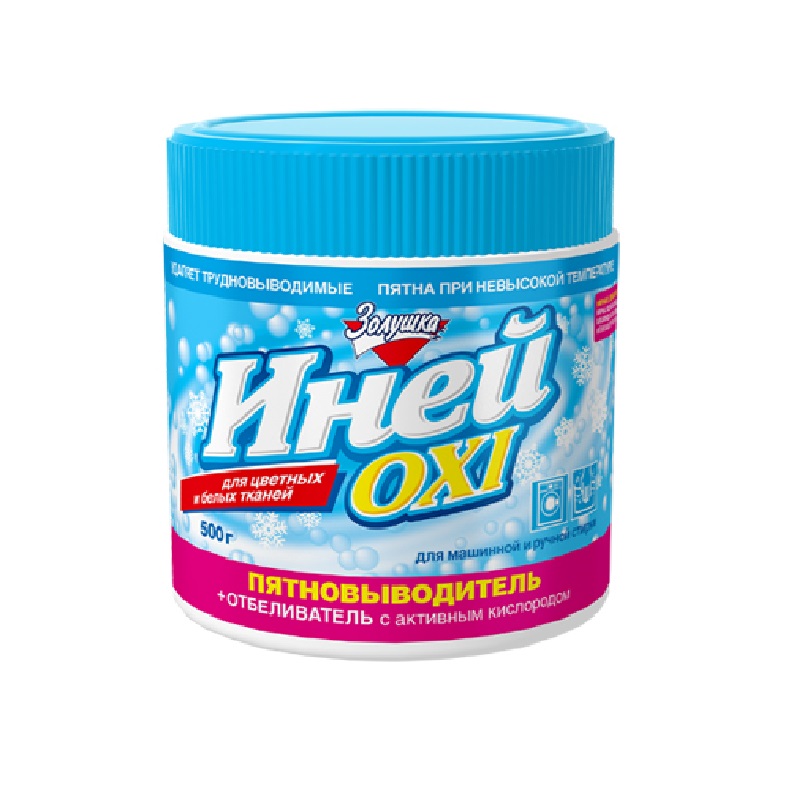 Удаление пятен при машинной стирке: Для удаления несильных пятен и загрязнений засыпать 1 мерную ложку (50 г) пятновыводителя «Иней OXI» вместе со стиральным порошком в соответствующий отсек стиральной машины (см. инструкцию к стиральной машине) для предварительной или основной стирки. Для удаления сильных пятен и застарелых загрязнений использовать 2 мерные ложки (100 г) пятновыводителя.