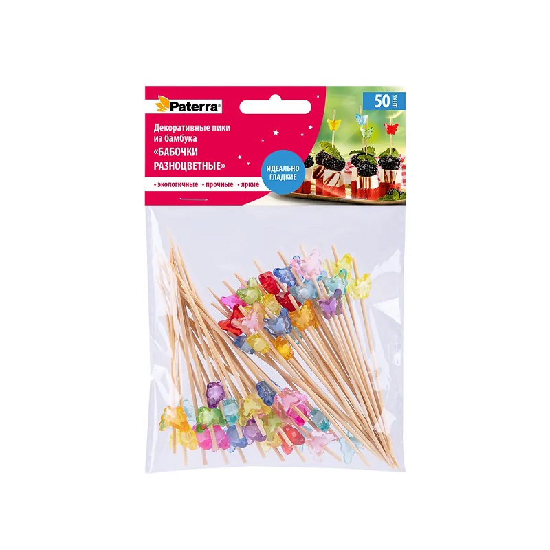 Купить Пики декоративные из бамбука Бабочки разноцветные 90мм 50шт /25 491-046 по доступной цене в Опт-Трио | Интернет-магазин товаров для дома и сада