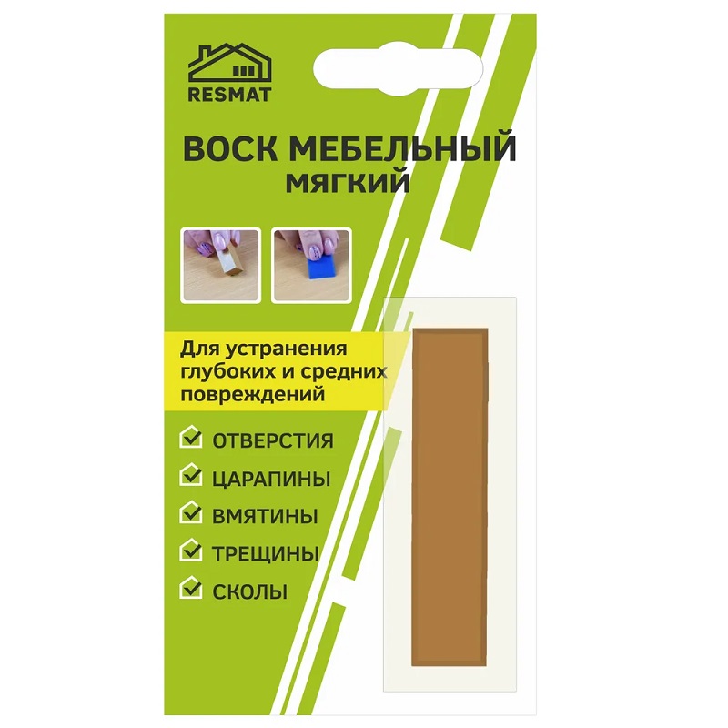 Воск мебельный мягкий от царапин, трещин, вмятин для реставрации мебели, дверей, окон (Орех канада). Воск мебельный мягкий предназначен для заделки глубоких и средних повреждений на деревянных, ламинированных и пластиковых поверхностях, не подверженных интенсивной эксплуатации. Для обеспечения влагостойкости и защиты поврежденного участка, рекомендуется поверх воска нанести несколько слоев фиксирующего лака: один за другим, давая высохнуть предыдущему 5 минут.