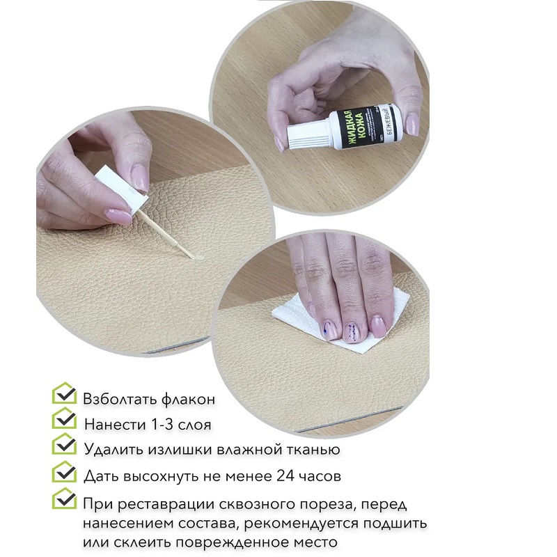 Кожа жидкая объемом 20 мл, во флаконе. Предназначена для восстановления кожаных изделий, изделий из кожзаменителей, прессованной кожи, эко-кожи. В комплекте есть кисточка для нанесения кожи. Поможет легко и быстро устранить любые порезы, трещины, прожоги на Вашем изделии. Основу жидкой кожи составляет водно-спиртовой раствор, который превосходно проникает в материал. После полимеризации расслоение исключено, ведь изделие и жидкая кожа становится одним целым. А после полного высыхания, при любом сжатии она восстанавливает исходную форму.
