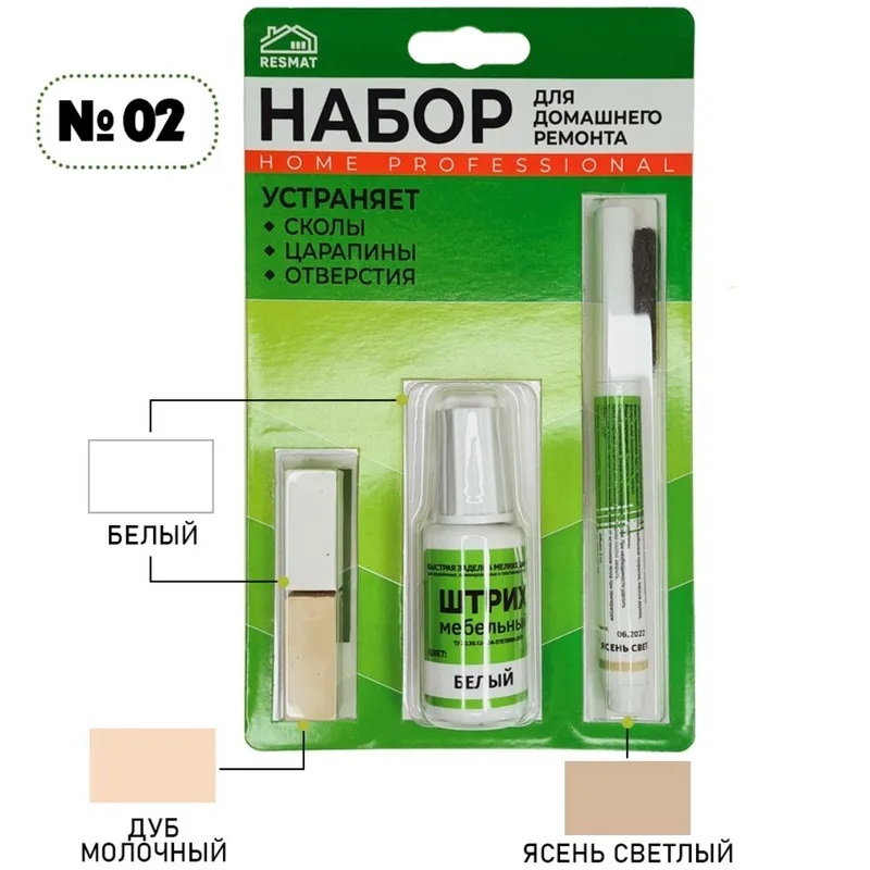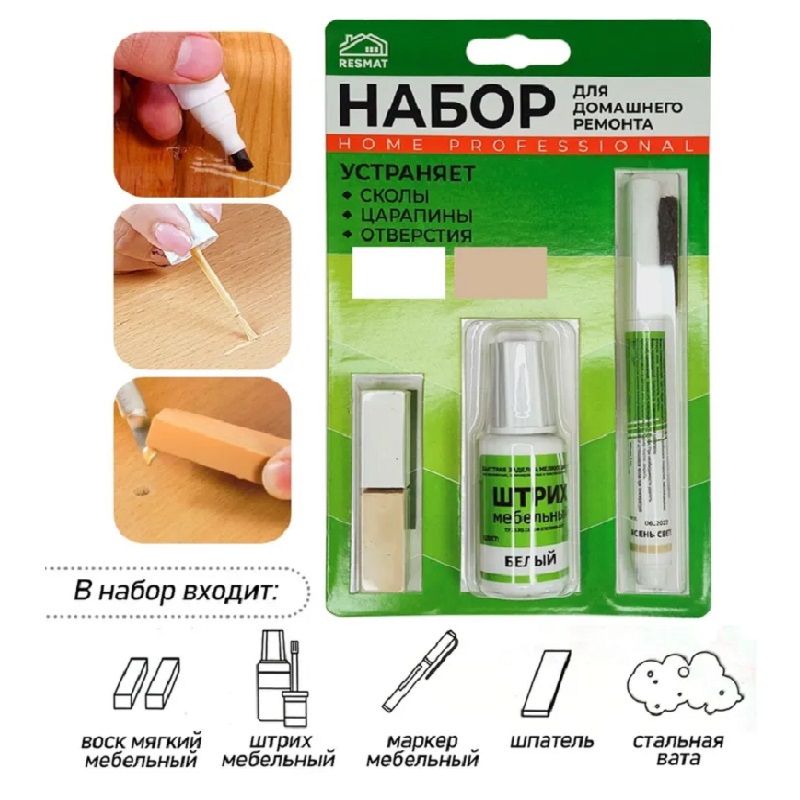 Набор включает в себя два восковых мелка 1 х 1 х 3 см, воск мягкий цвета белый и Дуб Молочный, Штрих мебельный белый 20 мл, мебельный спиртовой маркер 2 мл Ясень светлый, пластиковый шпатель и стальная вата. Подходит для ремонта мебельных фасадов, дверей, плинтусов, столешниц, полов, подоконников и т.п. из МДФ, ЛДСП, фанеры, массива дерева, ламината, пластика, пробки.