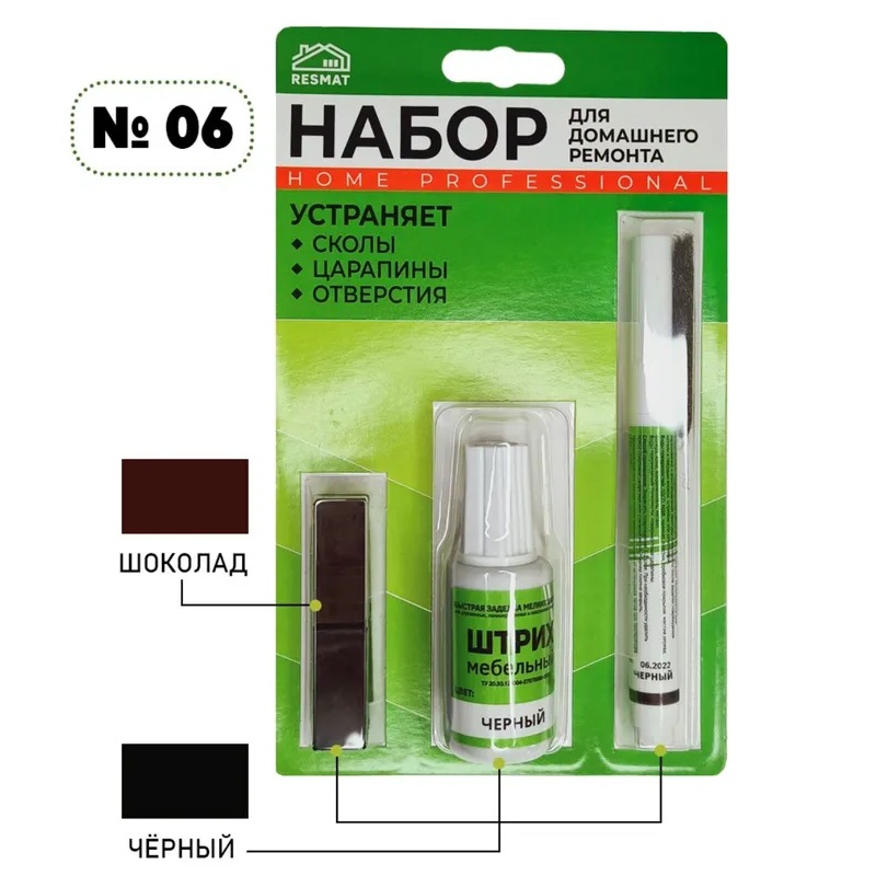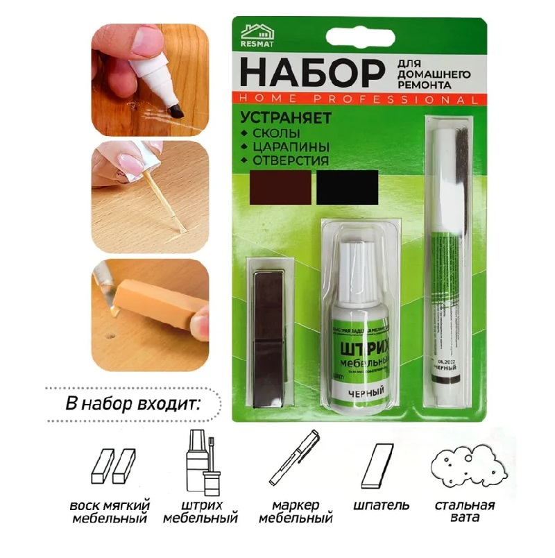 Набор включает в себя два восковых мелка 1 х 1 х 3 см, воск мягкий цвета черный и цвет Шоколад, Штрих мебельный черный 20 мл, мебельный спиртовой маркер 2 мл черный, пластиковый шпатель и стальная вата. Подходит для ремонта мебельных фасадов, дверей, плинтусов, столешниц, полов, подоконников и т.п. из МДФ, ЛДСП, фанеры, массива дерева, ламината, пластика, пробки.