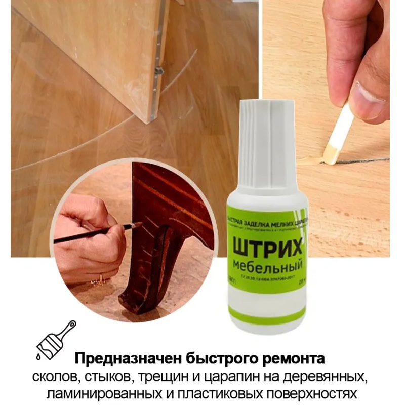 Штрих предназначен для мелкого ремонта мебели, реставрации повреждений, для заполнения малых и средних повреждений, устраняет сколы, царапины, стыки, проколы, швы.