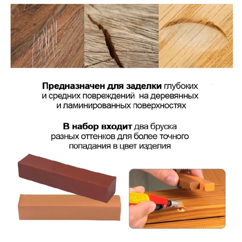 Воск предназначен для заделки глубоких и средних повреждений, сколов, царапин, трещин, вмятин на поверхностях, не подверженных интенсивной эксплуатации.