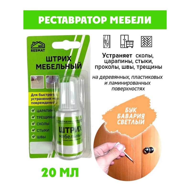 Предназначен для мелкого ремонта мебели, реставрации повреждений, для заполнения повреждений на деревянных и пластиковых поверхностях. Устраняет сколы, царапины, стыки, проколы, швы, трещины. Подходит для ремонта мебельных фасадов, дверей, плинтусов, столешниц, полов, лестниц, подоконников и т.п. из МДФ, ЛДСП, фанеры, массива дерева, ламината, пластика, пробкового покрытия. Наносить кисточкой, при необходимости в несколько слоев. Штрих текуч, легок в использовании, сохнет 15-20 минут, цвета легко колеруются. Образует влагостойкое покрытие, сверху можно покрыть лаком.