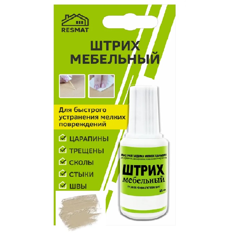 Предназначен для мелкого ремонта мебели, реставрации повреждений, для заполнения повреждений на деревянных и пластиковых поверхностях. Устраняет сколы, царапины, стыки, проколы, швы, трещины. Подходит для ремонта мебельных фасадов, дверей, плинтусов, столешниц, полов, лестниц, подоконников и т.п. из МДФ, ЛДСП, фанеры, массива дерева, ламината, пластика, пробкового покрытия. Наносить кисточкой, при необходимости в несколько слоев. Штрих текуч, легок в использовании, сохнет 15-20 минут, цвета легко колеруются. Образует влагостойкое покрытие, сверху можно покрыть лаком.