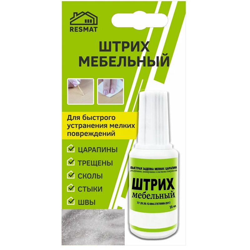 Предназначен для мелкого ремонта мебели, реставрации повреждений, для заполнения повреждений на деревянных и пластиковых поверхностях. Устраняет сколы, царапины, стыки, проколы, швы, трещины. Подходит для ремонта мебельных фасадов, дверей, плинтусов, столешниц, полов, лестниц, подоконников и т.п. из МДФ, ЛДСП, фанеры, массива дерева, ламината, пластика, пробкового покрытия. Наносить кисточкой, при необходимости в несколько слоев. Штрих текуч, легок в использовании, сохнет 15-20 минут, цвета легко колеруются. Образует влагостойкое покрытие, сверху можно покрыть лаком.
