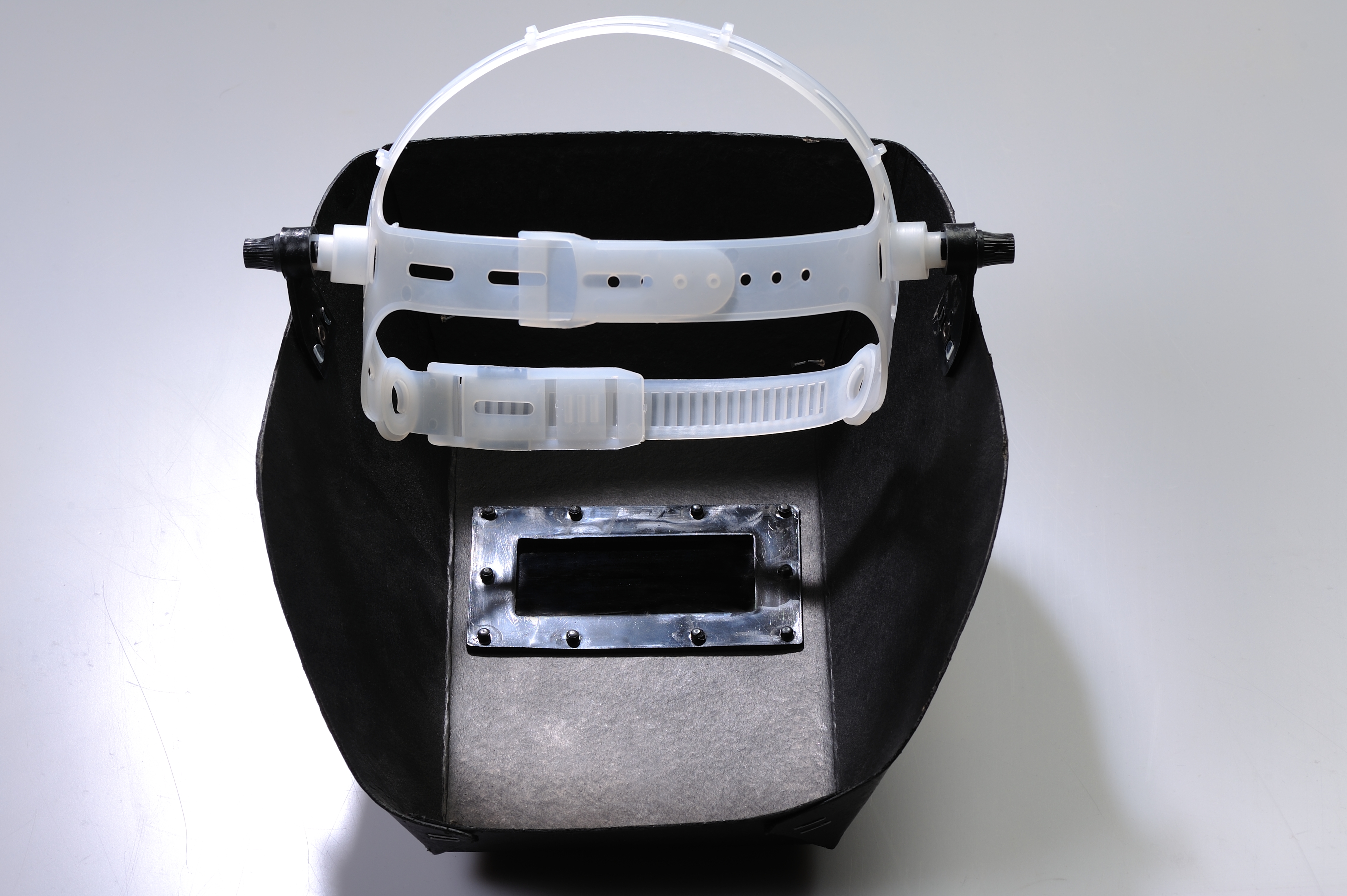 снятом щитке изменением длины теменных лент. Щиток имеет систему фиксации корпуса на голове в двух положениях: рабочем и