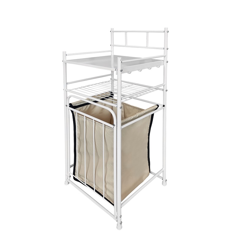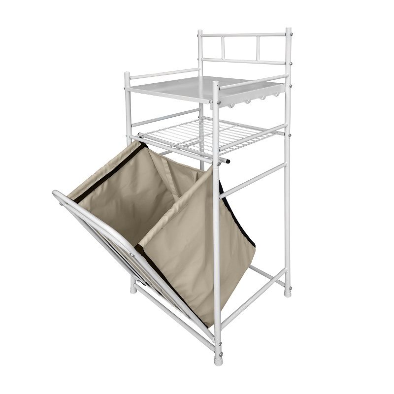 Корзина съемная и оснащена ручками. На стеллаже так же имеются четыре удобных крючка, на которые можно повесить полотенца.