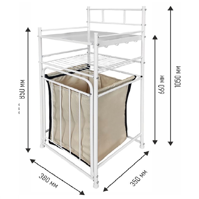 Размер стеллажа 38х35х105 см, размер корзины 30х30х50 см, объем корзины 45 литра. Выполнен из металла и прочной ткани Оксфорд.