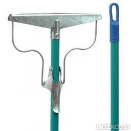 имеется пластиковый колпачок с петлей. Тряпка зажимается с помощью пружинной проволоки. Длина ручки 120 см.
