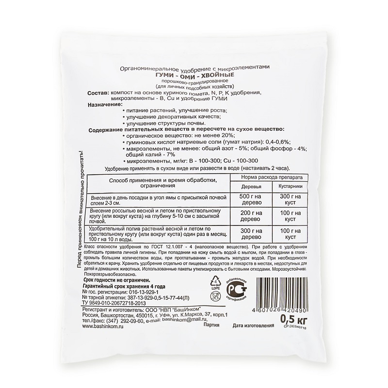 Порошково–гранулированное удобрение с необходимыми для питания хвойных культур макро- и микроэлементами и эликсиром плодородия Гуми. Повышает урожайность, плодородие, улучшает структуру почвы и улучшает качество продукции.