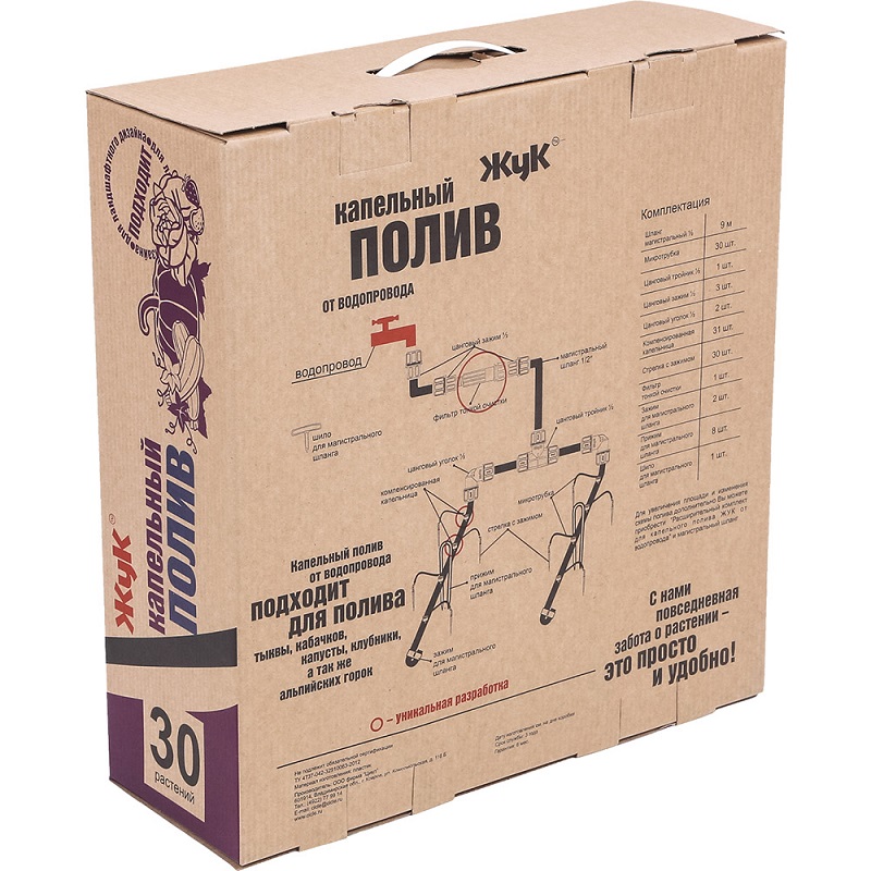 Комплектация: электронный таймер для полива, шланг магистральный - 9 м, микротрубка - 30 шт.,цанговый тройник 1/2-1 шт., цанговый зажим 1/2-3 шт.,цанговый уголок 1/2-2 шт.,компенсированная капельница - 31 шт.,стрелка с зажимом - 30 шт.,фильтр тонкой очистки -1 шт., зажим для магистрального шланга -2 шт., прижим для магистрального шланга- 16 шт.,шило для магистрального шланга