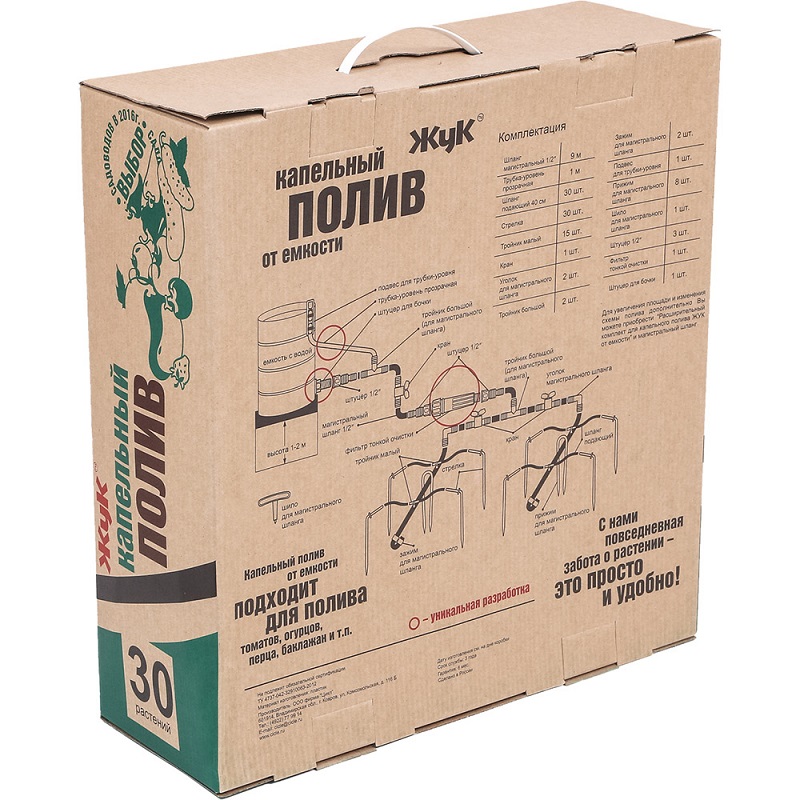 В комплект для капельного полива ТМ "Жук" входит штуцер присоединения к ёмкости, которого у других производителей нет.Все шланги в комплекте выполнены из чёрного полиэтилена, что предотвращает зацветание воды в полостях шлангов;