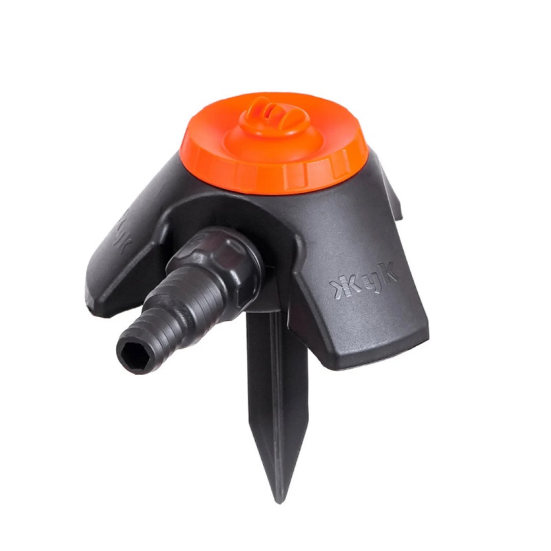 Подключается к насосу или водопроводу.Распыл осуществляется по радиусу вокруг насадки, при использовании щелевой насадки на форсунку полив осуществляется по прямой ( поливочная полоса длиной 4-6м шириной до 2м)