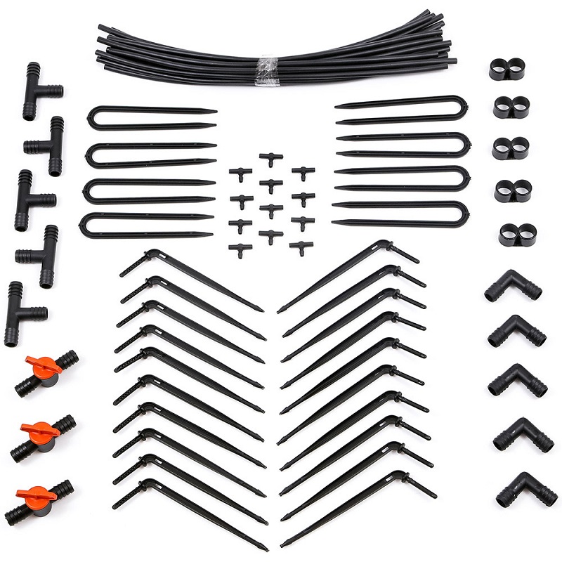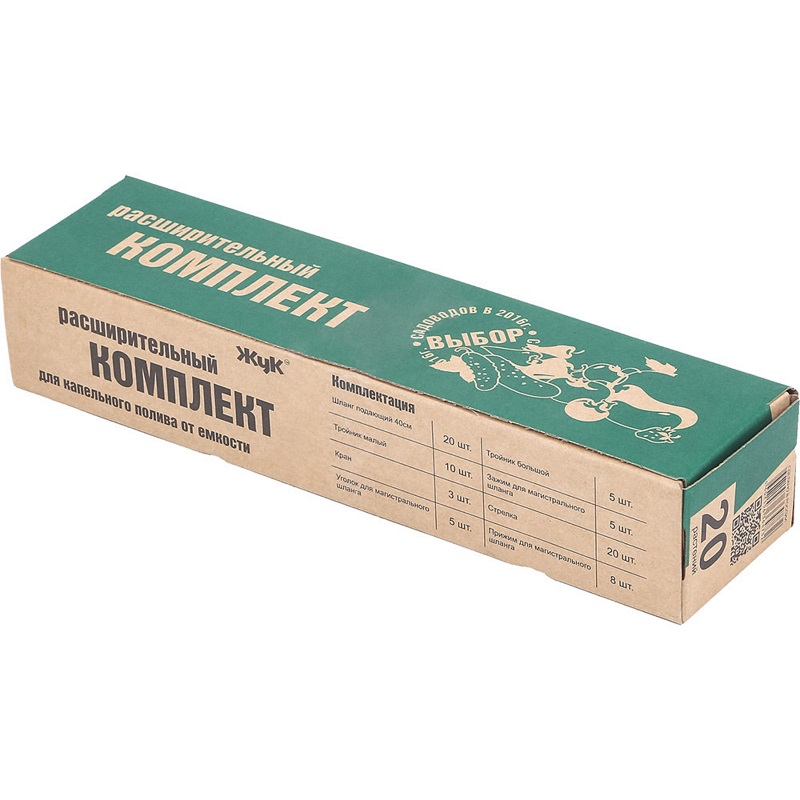 Комплектация: шланг подающий 40 см -20 шт, капельницы - 20 шт, тройник малый - 10 шт, кран - 3 шт, уголок для магистрального шланга - 5 шт, тройник большой - 5 шт, заглушка для магистрального шланга - 5шт, прижимы для магистрального шланга 20 шт.