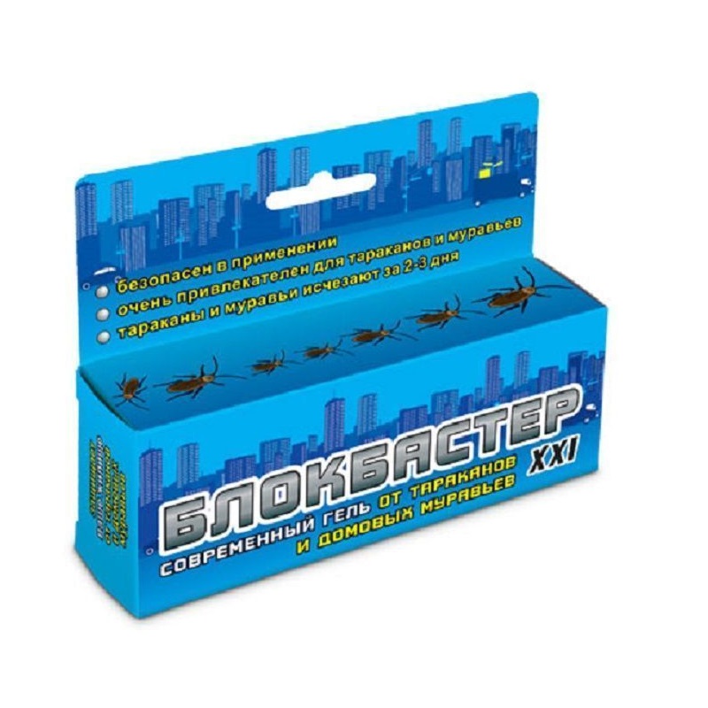 Это современное, инновационное средство. Отличительное свойство этого геля в том, что он содержит в своем составе сразу два действующих вещества (тиаметоксам и альфа-циперметрин). Они усиливают действие друг друга и уничтожают даже самых устойчивых тараканов. Гель «Блокбастер XXI» уже через 2–3 дня полностью истребит всех тараканов в доме. Гель обладает «каскадным» эффектом: даже один отравленный таракан передает смертельную дозу яда своим сородичам в количестве до 50 штук. Входящие в его состав привлекатели заставляют тараканов предпочитать эту приманку любой другой пище. Гель «Блокбастер XXI» не портится, не высыхает и не теряет своей эффективности очень долгое время. Гель удобен в применении, легко наносится в труднодоступные места. Не имеет неприятного запаха, не выделяет в воздух вредных веществ и может применяться людьми, страдающими аллергией или астмой. Входящая в его состав, горькая для млекопитающих добавка «битрекс» предотвращает случайное поедание геля домашними животными.