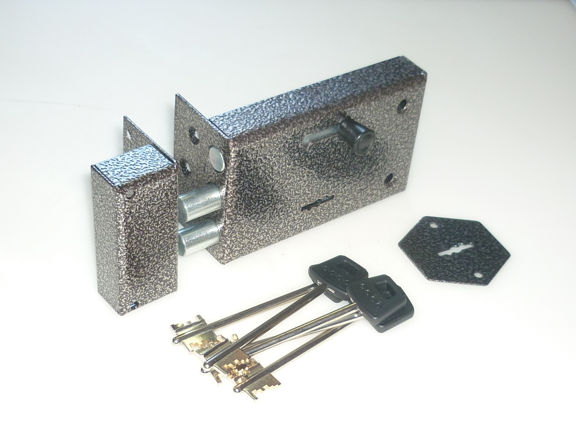 Замок накладной сувальдный с задвижкой. Предназначен для установки на металлические двери. Замок имеет засов из четырех цилиндрических ригелей диаметром 18 мм, с максимальным вылетом 40 мм, и задвижку диаметром 18 мм с вылетом 30 мм. Удаление ключевого отверстия - 64 мм. Количество полуоборотов ключа - 4. Габариты замка - 135х146х32,5 мм. При закрытом на задвижку замке использование ключей с наружной стороны невозможно. Защита от вскрытия замка отмычкой, защита от высверливания стойки ригеля и защита от вскрытия методом проворота.